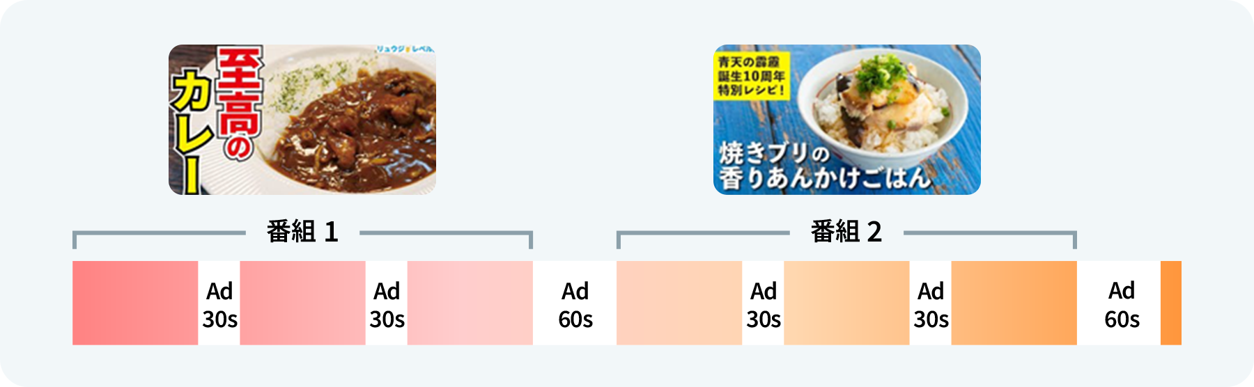 オープンオークション広告を掲載することで、CTVで高い視聴率を実現しています。番組中は5分ごとに30秒の広告、番組の合間には60秒の広告が表示されます。広告は視聴中の放送に対して瞬間的に挿入されるため、ユーザの視聴体験を極力妨げることがない仕組みとなっています。