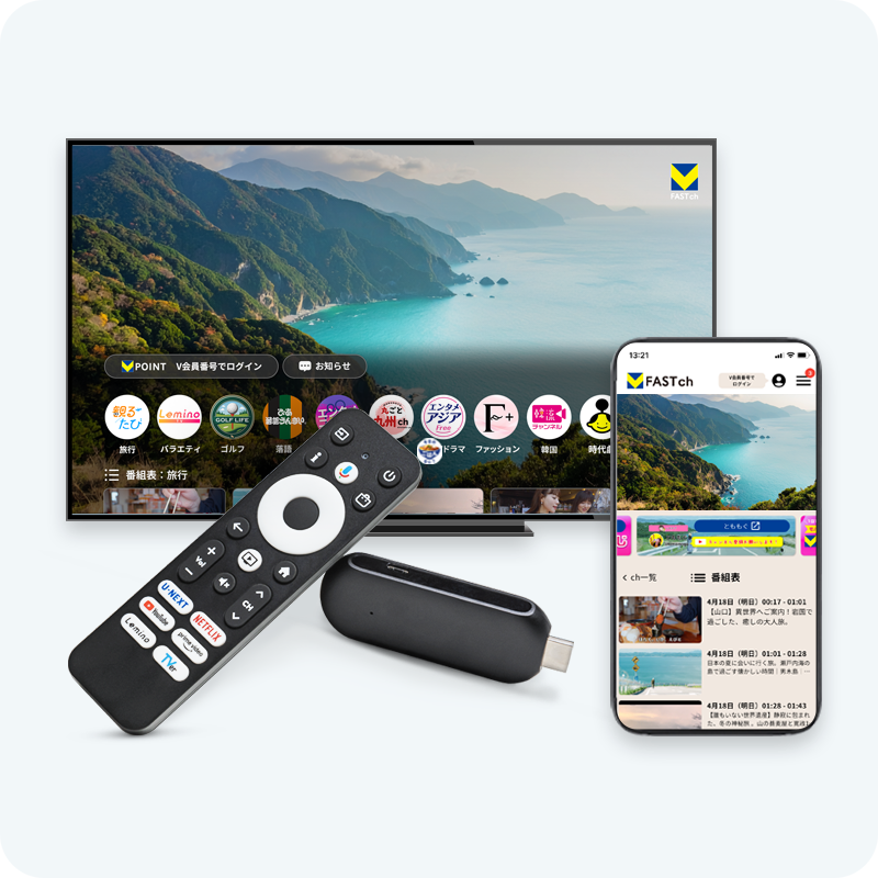 会員数8000万人を誇るVポイントユーザに対して、見るだけでポイントが貯まる「VFASTチャンネル」を展開しています。提供手段はTVやスマホのアプリに加えて専用Stickなど、幅広く展開されています。